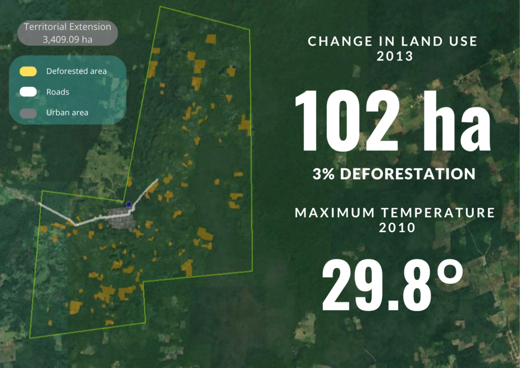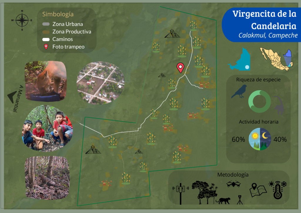 Los mapas, como el que se muestra en la Figura 1 (MAPA_VIRGENCITA.gif)del proyecto, son herramientas visuales muy efectivas. Este, por ejemplo, muestra cómo las áreas deforestadas han evolucionado en Calakmul, específicamente en el territorio de la Comunidad La Virgencita de la Candelaria, a lo largo de diez años. Al combinar esta información con datos de estaciones meteorológicas y registros de especies vulnerables, se refuerza el mensaje de la importancia de proteger el bosque. Asimismo, es información que ha sido presentada en asambleas comunitarias para tomar decisiones alrededor de cómo mejorar el manejo territorial y sus recursos.