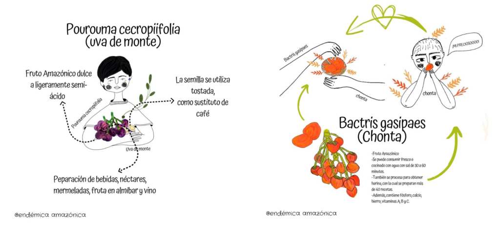 El grupo definió temáticas, una lista de alimentos y nos organizamos para repartir las responsabilidades. En mi caso, elegí centrarme en los alimentos amazónicos. Con ese tema, diseñé infografías simples, pero poderosas: ilustraciones naturalistas, acompañadas de los nombres científicos, locales y datos sobre el valor cultural y alimenticio de cada alimento (Figura 3). Utilicé herramientas accesibles como Sketchbook (Enlace), Canva (Enlace) e información de iNaturalist (iNaturalist) para construirlas. Mi objetivo era claro: demostrar que estos alimentos son mucho más que ingredientes; son parte de nuestra identidad, historia y una conexión profunda con la tierra.