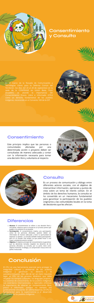 Consentimiento y Consulta En el marco de la ‘Escuela de Comunicación y Tecnologías Libres para la Defensa Común del Territorio’, los días del 20 al 28 de septiembre en la sede de la CONFENAIE en Union Base, Puyo (Ecuador), se abordó la importancia del Consentimiento Previo, Libre e Informado (CPLI) como un derecho fundamental de […]
